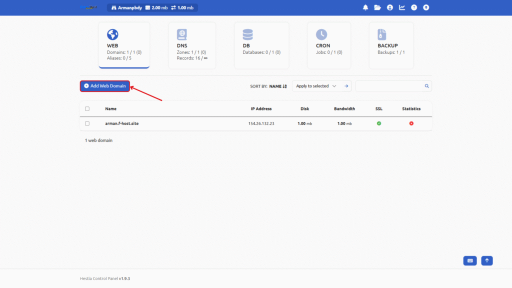 Klik Add Web Domain di Panel dan pilih Buat atau transfer website Anda: