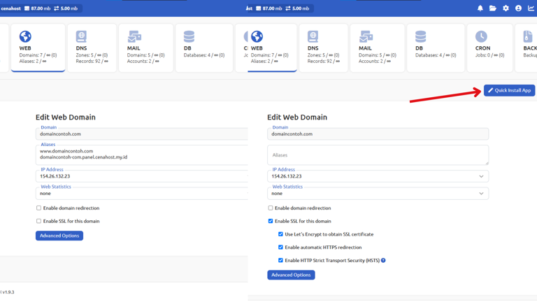 Selanjutnya, kamu perlu menghapus aliases dan menceklis enable ssl untuk mengaktifkan ssl pada domain kamu. kamu juga bisa melakukan quick install apps seperti laravel, wordpress, dan lainnya.
